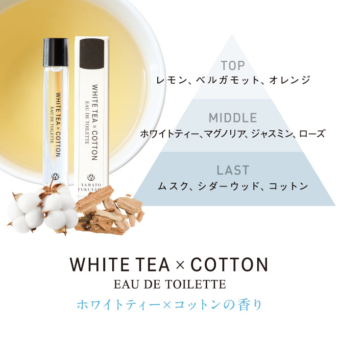 繊細で瑞々しいホワイトティーにフローラルを添え、コットンノートで包み込んだ穏やかさと清らかさが織りなす香り。