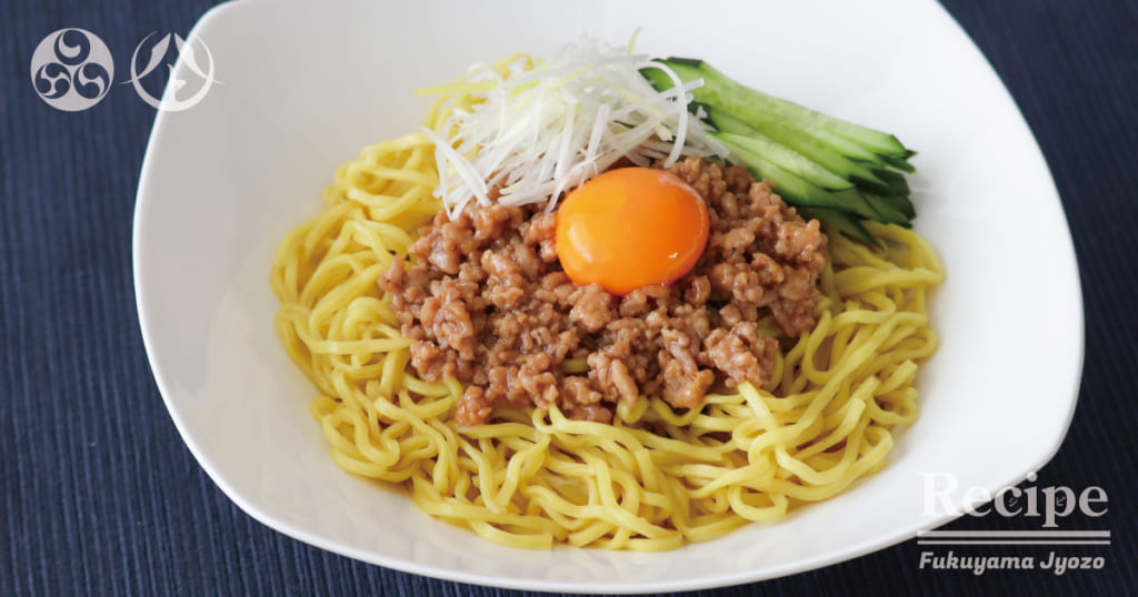 4. 麺の上に➁を盛り、きゅうり、白髪ねぎ、黄身を盛り付けます。